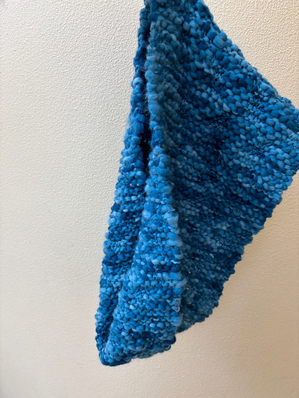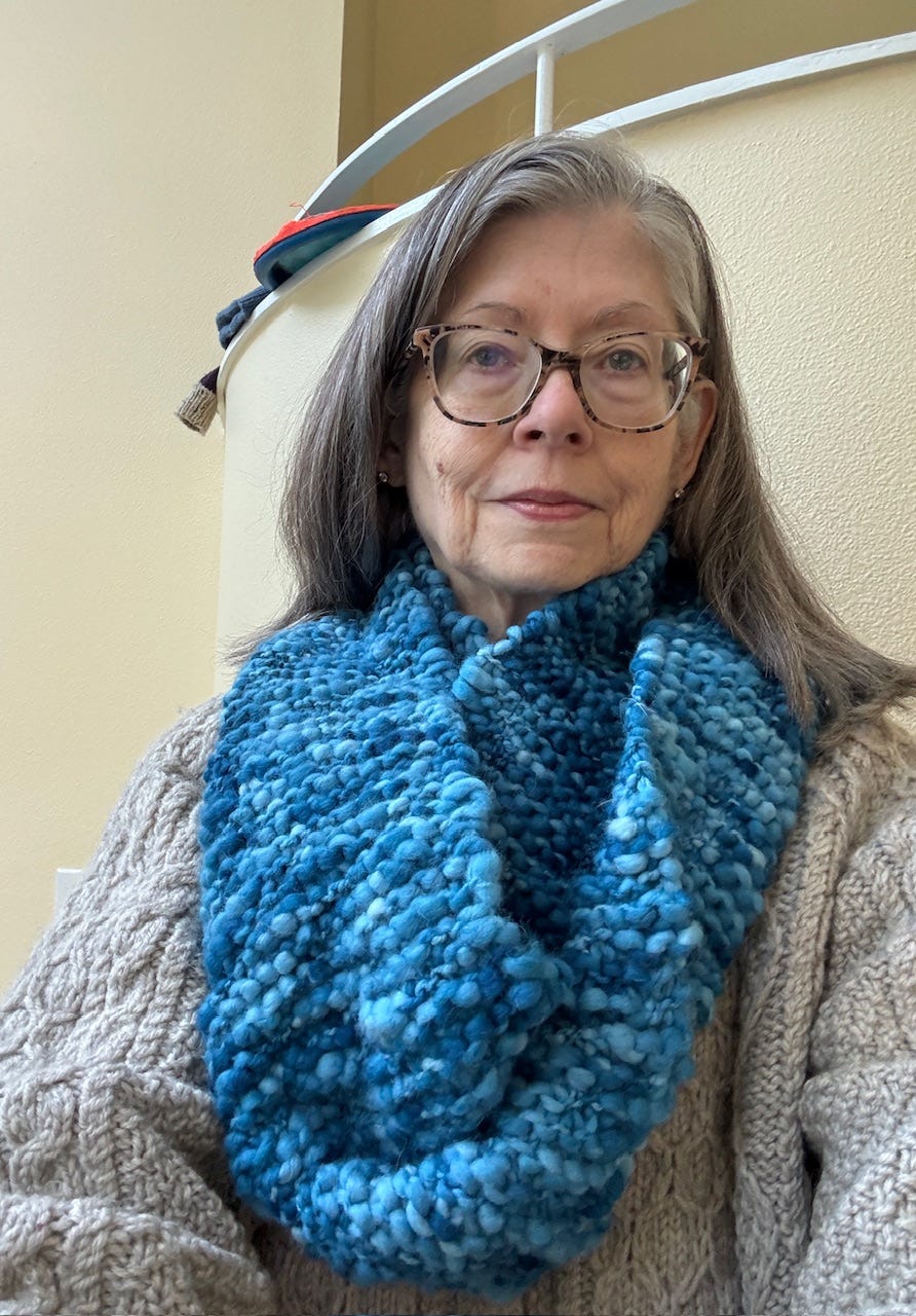 It’s a cowl thing. The yarn is a bulky weight thick and thin wool from Butternut Woolens (no longer in business). I cast on 30 stitches, knit in garter stitch till I had just enough yarn left to bind off. I put a twist in it and sewed the ends together.