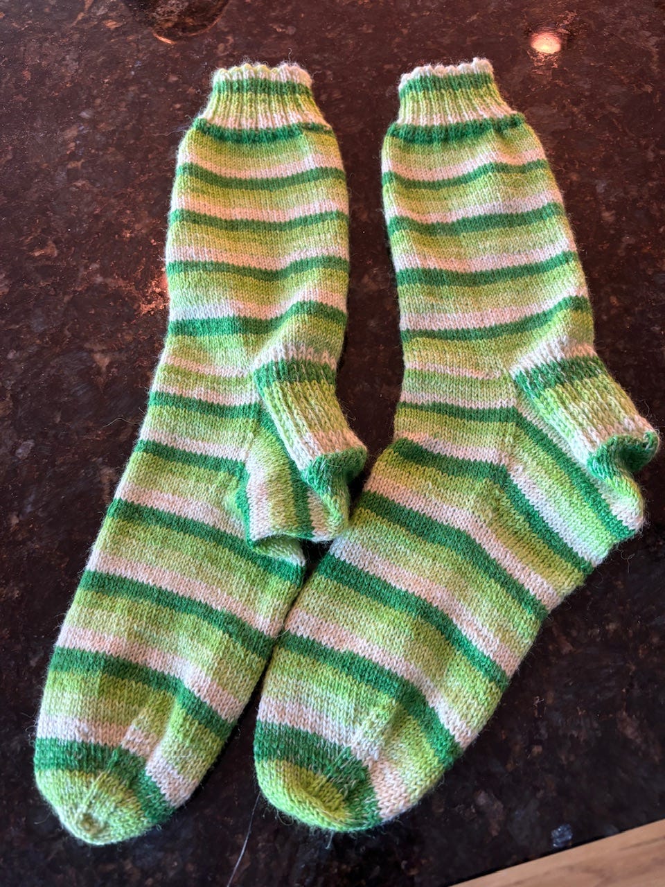 That’s West Yorkshire Spinners sock yarn, color name Mojito. They are quite cheerful. I used the same pseudo-pattern that lives in my head, and size 2.00 mm bamboo double point needles.