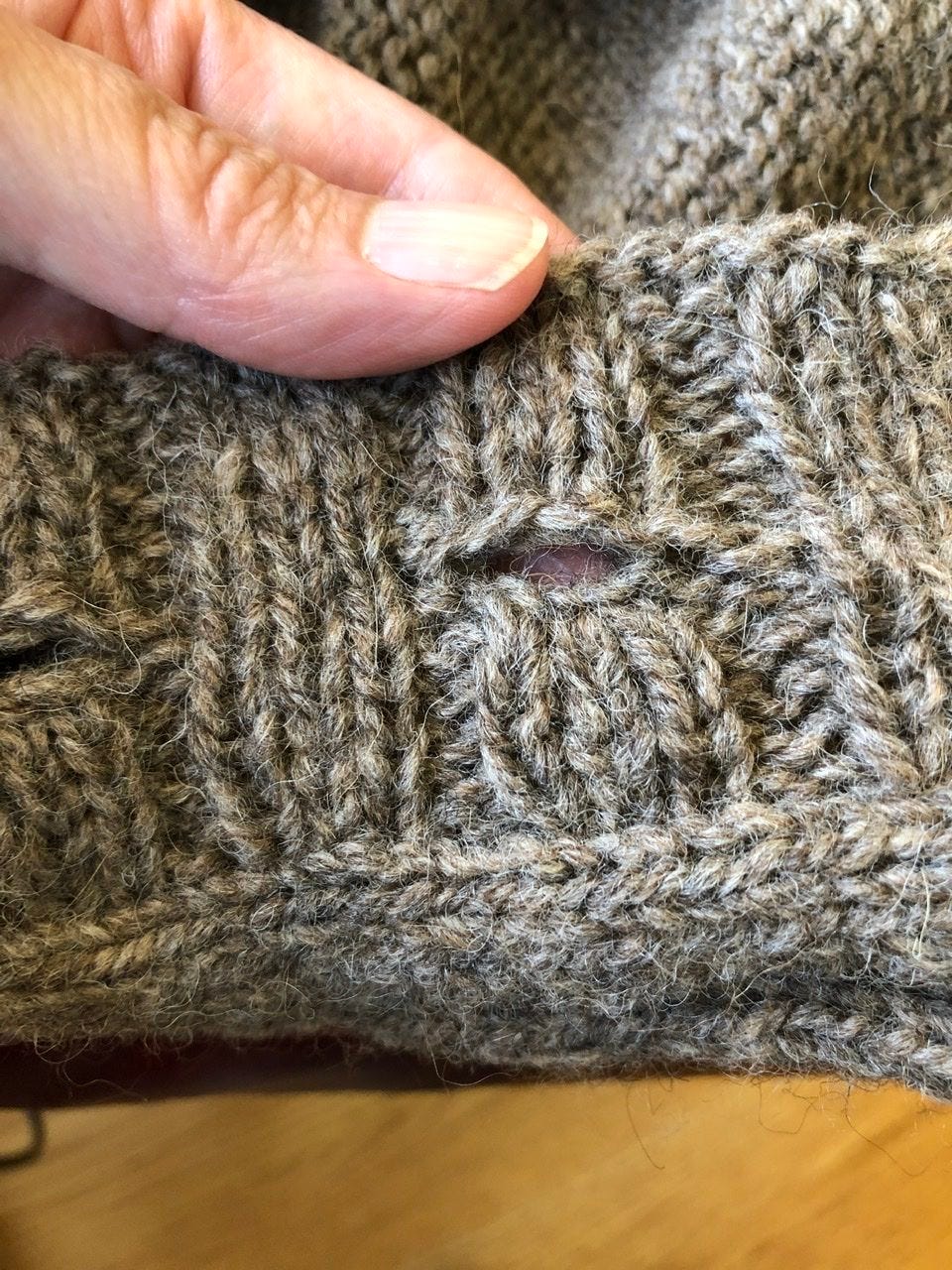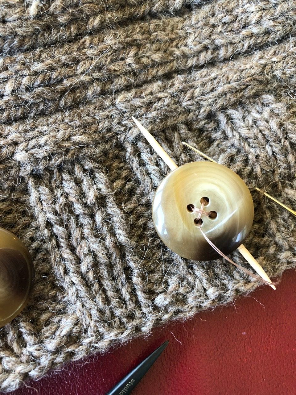 Of course, where there are buttons, there should be buttonholes. I did remember to put those in as well. I fidgeted around with a couple of different methods of knitting these, and settled on a one-row buttonhole using the “TULIPS” method. Here’s a link to an article about how to do these, and a video explanation as well. These look really complicated, but once you’ve done one, it all makes sense. It’s the best of the horizontally placed buttonholes that I’ve found.