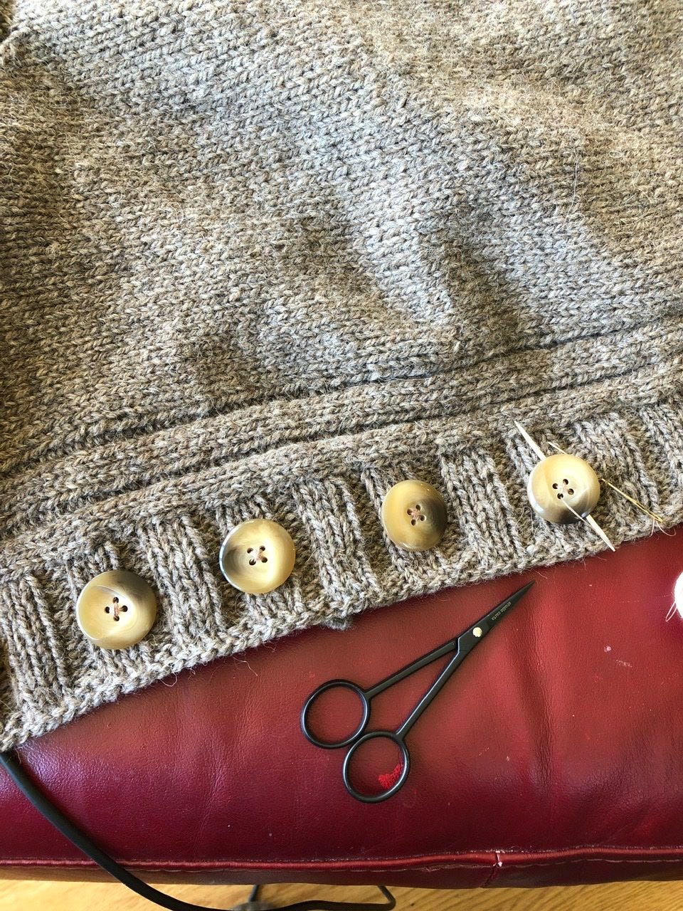 I finished the knitting on my Dockside Cardigan over the weekend, and sat down this morning to sew on buttons. Button-sewing is not my favorite task, and it needed to get done in the morning hours when it is still relatively cool around here.