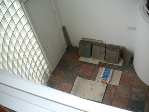 That would be my house at the moment. The remodeling is proceeding, though messily and slowly. The front entrance tile is almost in, and the grouting and finishing will hopefully be done in a few days. The boys are here to sand the wood floors this morning, and we are plastic-sheeted into a corner of our house. After the floors get finished, the other boys will come and paint the whole upstairs. I will almost be glad to go back to work tomorrow so I can pretend this just doesn't exist for awhile.