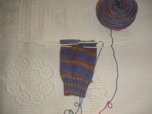 Lest you think that all I do is shop for yarn and dream about new projects, here are photos of actual knitting. The three projects are the Rogue sweater, the Black Hole Birch shawl, and the Lorna's Laces socks.