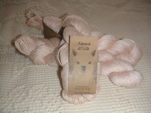 Last but not least, Alpaca & Silk, from Blue Sky Alpacas, purchased from Knit Pixie. I want one of everything they have for sale! This will be a lacy scarf someday when it grows up. It is indeed as pretty as it looks.