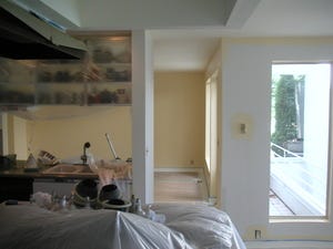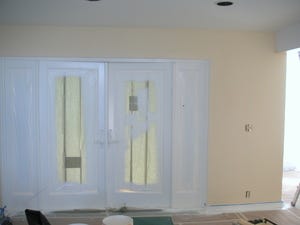 Here are our new French doors out to our patio, with the first coat of yellow on the walls: