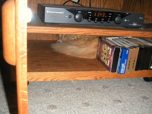 Lucy the Cowardly doesn't think much of the whole project. Being the big chicken that she is, she has discovered this spot in the TV/cable box cabinet to hide out.
