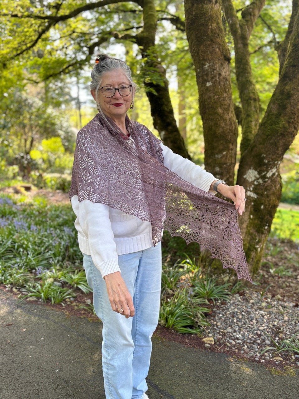 This was such a fun pattern to knit! And it really didn't take that long to knit. I started it 2 years ago, then it sat in the huge pile of unfinished shawls until a few months ago. It also isn't a difficult shawl pattern, the patterning looks complex, but the wrong side rows are all purled, and the charts are easy to follow. The pattern has no glitches or head-scratching places. The stitch patterns are fun, and keep the knitter interested.