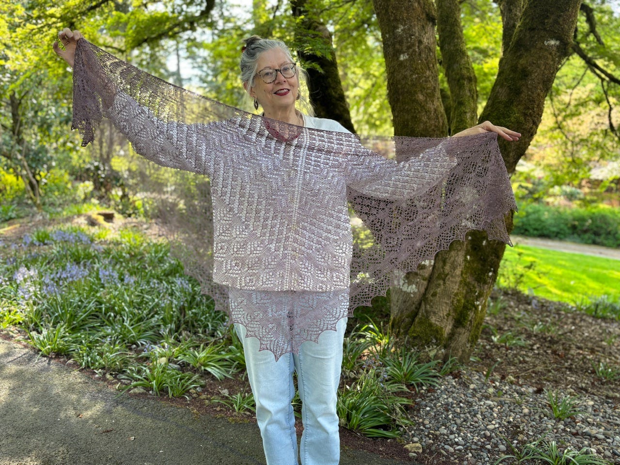 Several months ago, I posted a picture of my pile of unfinished projects, which included seven shawls. This was one of them. Of the seven, I've finished four of those shawls. Of course, there are more. Somehow, despite my good intentions for finishing the seven before starting new ones, I've cast on some. So now I have FIVE shawls in progress. I guess that is still forward progress.