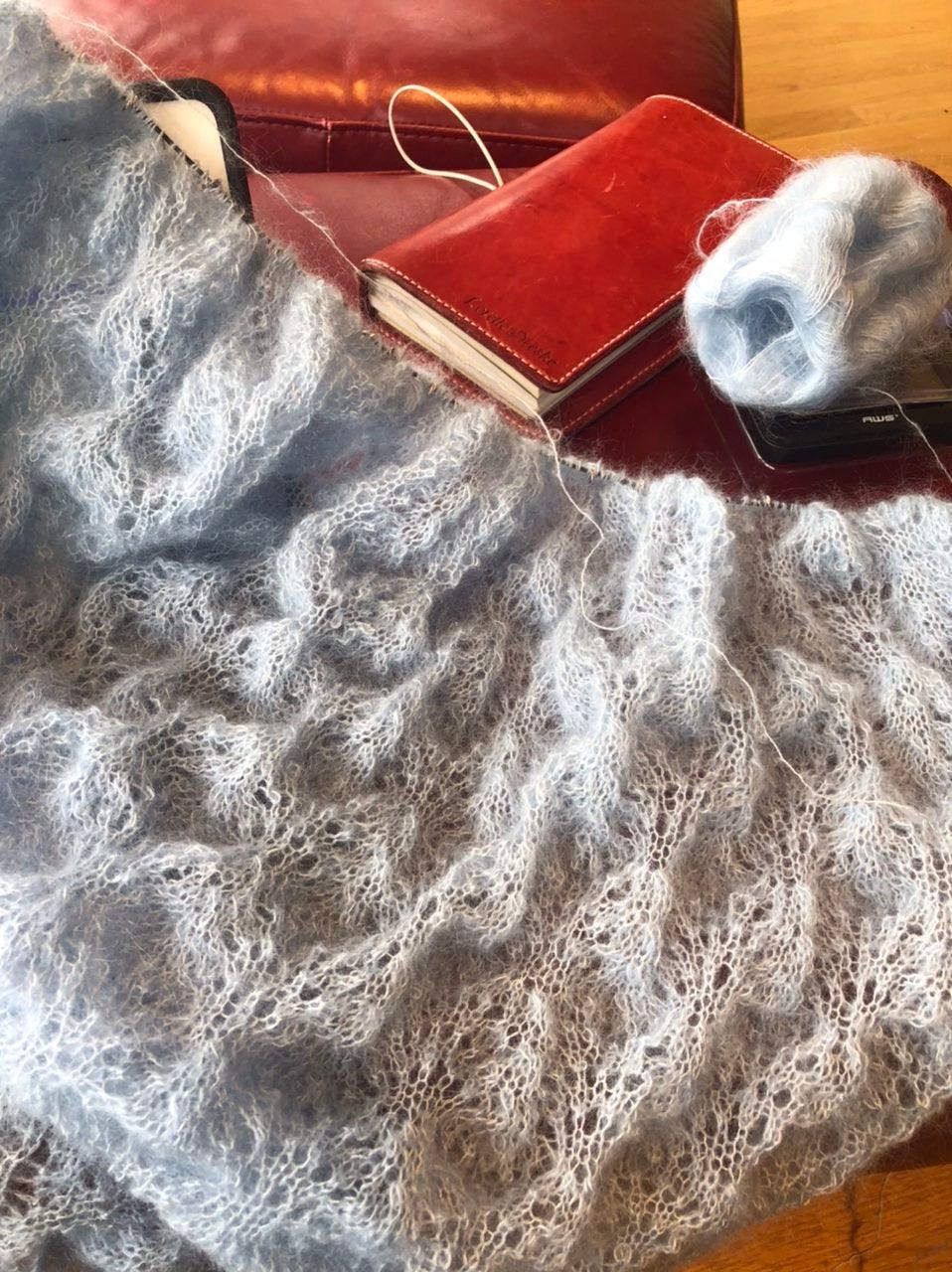 This is a pretty dead-easy pattern, though knitting it in this yarn means you have to be very careful to not make errors. Ripping this stuff out is nearly impossible. It’s one of those shawl patterns that you can adjust to fit the yarn you have, I had three skeins of this yarn, and just kept knitting repeats. I have 5 rows left in my current repeat, and about 8 grams of yarn left, so will bind off at that point. Each row is taking at least half an hour though, and I have close to 400 stitches on the needles. I keep thinking “I can finish this today”, but see above about not being able to undo mistakes, so I’m just taking it a row at a time.