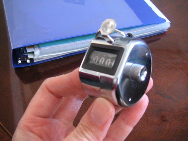 This is my favorite row counter. It's a "clicker counter" from the office supply store. I have 4 or 5 of these, so I have them in every project bag. They are cheap, and count up to 9999, in case you have a project with that many rows.