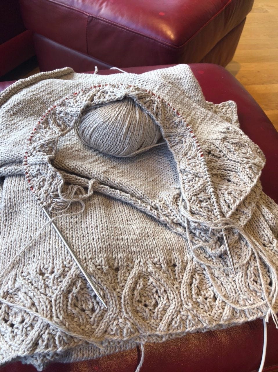 This is knit in pieces, which is hands down my favorite way to make sweaters. The front lace bands are knit along with the fronts. After the pieces are seamed, the live stitches at the top of the band are picked back up and the lace continues around to meet at the center back.