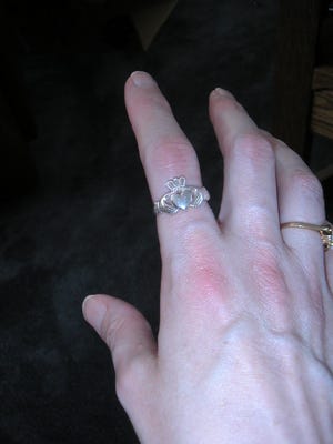 I got new jewelry out of the deal, at least. When I cut the tendons, I also cut the fibrous sheath/pulley that holds the tendons in place, so I have to wear a protective band on my index finger for the next year to protect it. I finally got tired of the adhesive tape thing that I was doing, and we went to buy a ring last week. Here it is: