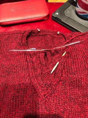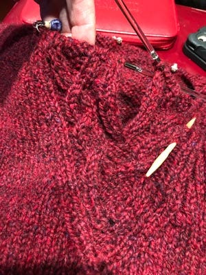Is having just a few minutes for a cup of tea and knitting before I head off to work. I finished the sleeves for Rogue yesterday and picked up the stitches around the neck for the hood, which is full of delicious cables.