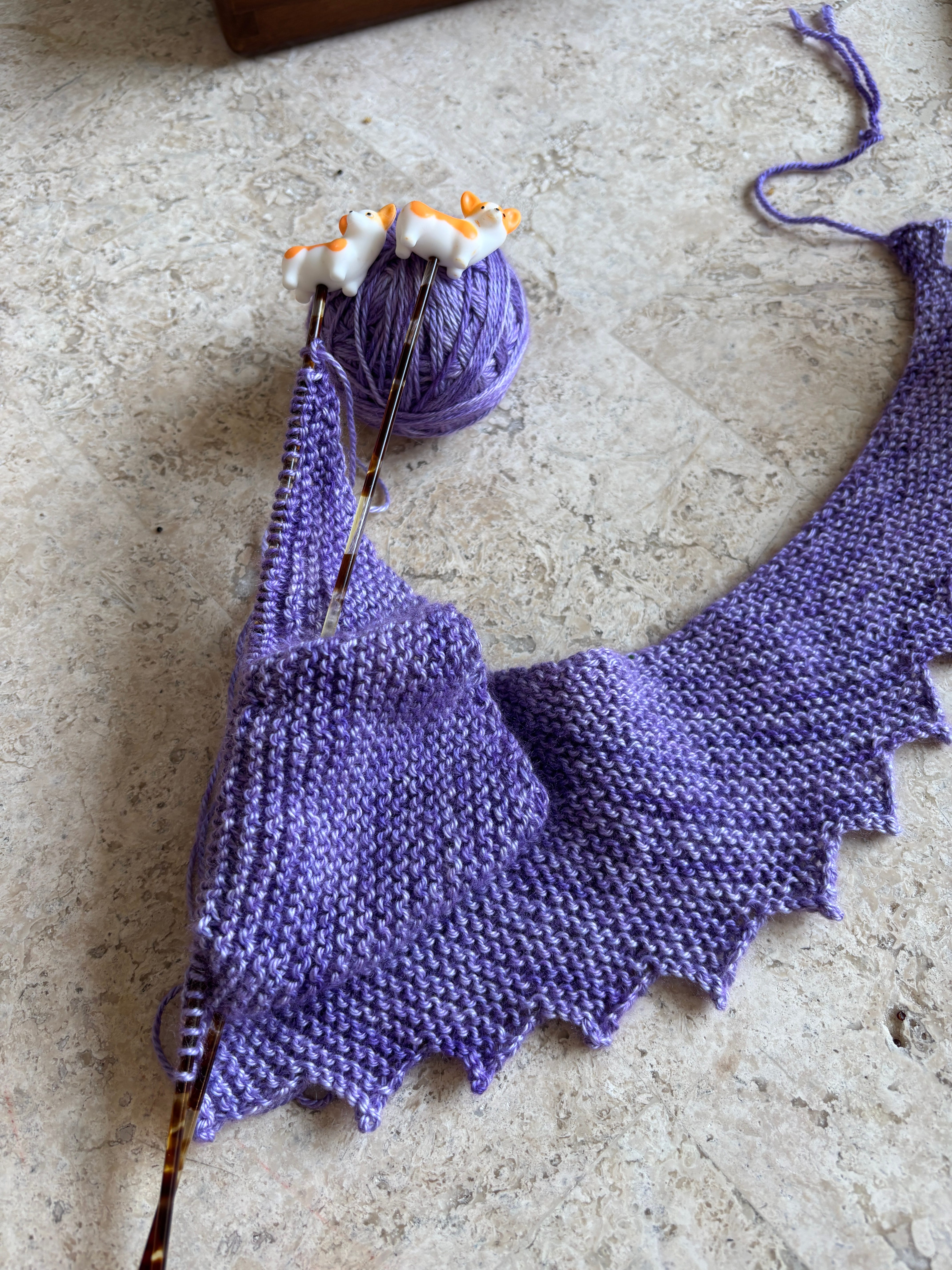 Aren’t those just the cutest things ever? I found them at Miss Babs. That pretty purple yarn is also Miss Babs, her Sojourn cashmere/silk fingering blend. The pattern is a Hitchhiker, which is a good mindless knitting project for when your brain has exploded from all the things swirling around that need doing.