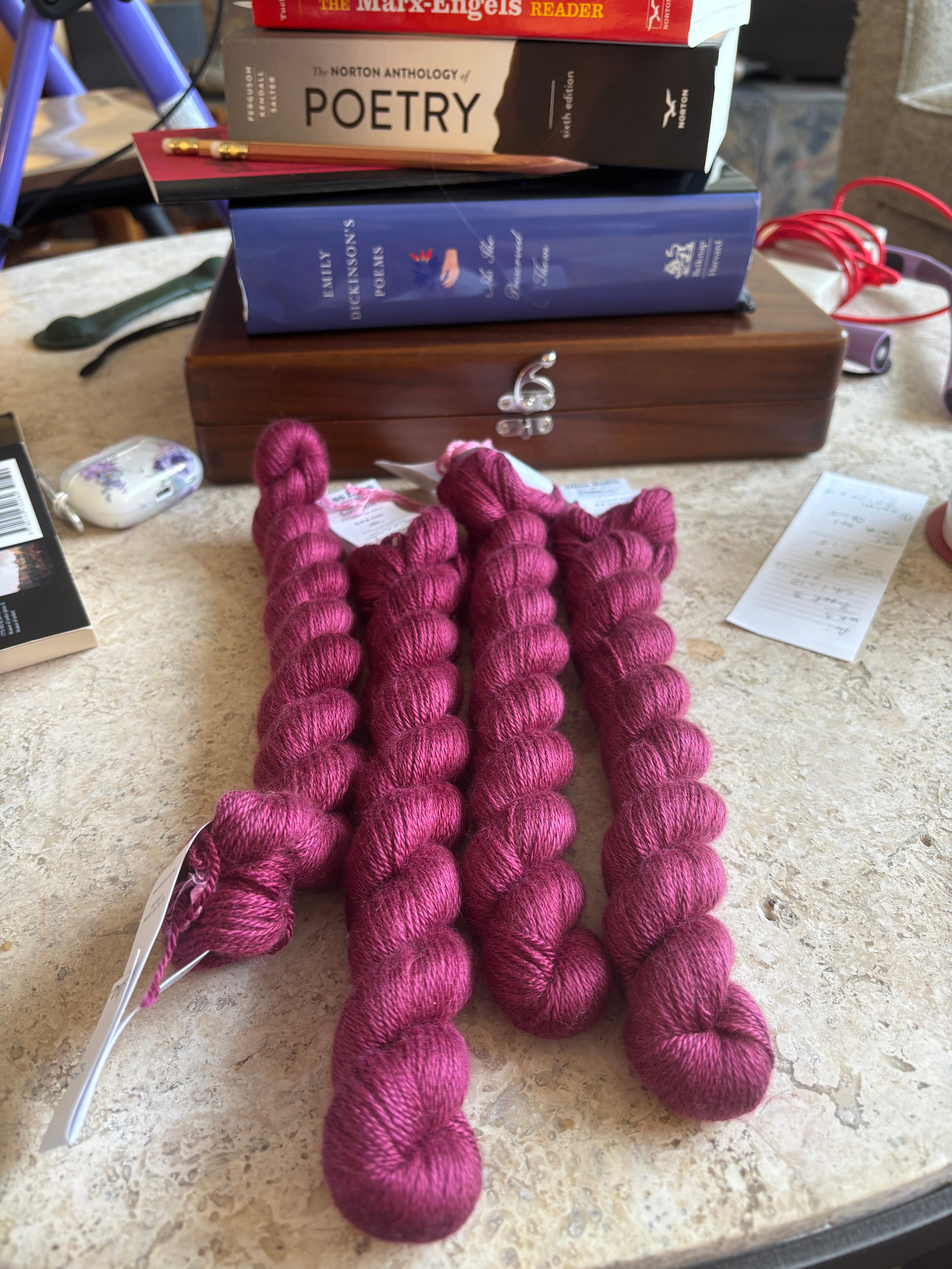 Isn’t THAT pretty?? It’s also Sojourn, enough for a good-sized shawl. Because who doesn’t need a big-assed cashmere silk shawl to wrap up in? The color name is Bloodstone. I don’t have a pattern picked out yet, but it will be one where I can use every last inch of this stuff. Yes, it was ridiculously expensive. No, I don’t feel one bit guilty.