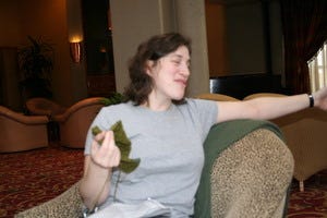 I met with Kris again, who was getting a lesson in the lobby from a spinner, Blogless Betsy, on how to use a drop spindle. And met Kris' family, including that adorable child of hers, Anna Grace. If I could have been guaranteed offspring that cute, I might have been convinced to reproduce at one point in my life. I didn't get a picture of Betsy either.