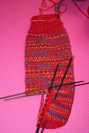 Now it's back to reality, though I got a real gift this morning at 7 AM. I had signed up for an extra day of work today, for some reason that totally escapes me. (My husband reminded me that it was no doubt to pay down the yarn debt, which is starting to rival the national deficit.) As I was getting my butt out of bed, grumbling to anybody who would listen, the phone rang. It was from one of my partners, to let me know that they weren't busy enough to need me, go back to bed. Free knitting time!! Here's where I am on the sock: