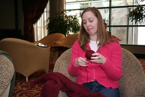That's Jessica, from Rose-Kim Knits. She's working on her Knitting Olympics project, and I learned a few new swear words from her on Saturday.
