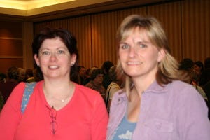 Here's a picture of Kris and I. It came out a bit blurry, but proves that without a doubt we exist. For some reason I didn't get a picture of Marti. And none of my pictures of the Harlot's talk came out. Honest, I had green tea with dinner, nothing else.
