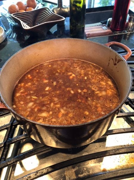Soak your beans. You can either do this the night before, or do a quick soak like I do. Pick over your beans, rinse, then put in a large saucepan, cover with a couple of inches of water. Bring to a boil, then turn off and let them sit while you get everything else ready.