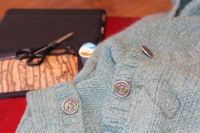 The buttons on this sweater have literally been hanging by threads for awhile, enough so that I haven't been able to wear it. That's just silly, so I got out needle and thread and shored them all up. Ready for winter!