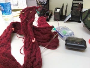 I'm now making forward progress, at least for the moment. The Major has finished the bottom cable, and has picked up all those stitches along one edge for the hem. I'm hoping to get that far this weekend, which I have OFF from my new job! Have a good one, all of you!