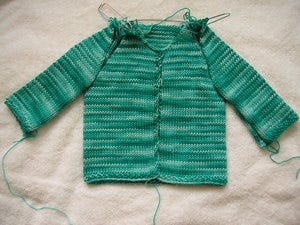 Now I just have to sew them all together, and do the collar finishing. This is Stephanie's Daisy pattern from Knitty. I have plenty of yarn left over, so I think I will put the hood on as well. I am making this in the middle size, to fit a larger baby. I figure all new babies get a ton of cute infant outfits that they wear once before they grow out of them. This one will fit him when he's more like 8 months old. With the sleeves rolled up, he can wear it while it's too big, and the wearing season can be stretched for at least a couple of months.