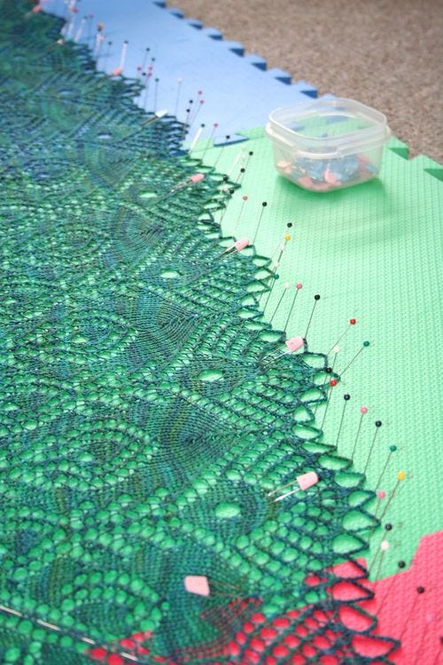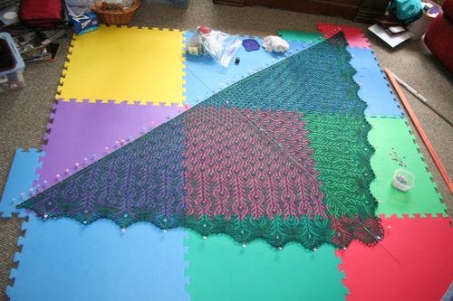 I think I used about a million pins on that border. This is the part where I'm really glad that I have my blocking tools. I soaked the whole thing in soapy water for awhile, then threaded blocking wires (welding wires bought in a large tube from Airgas) through the top and down the center. The bottom scalloped border is pinned. The mat underneath is a whole stack of those kiddy play mats, which I love. I can crawl around on them on my hands and knees without getting bruised up, and I just pin right into them.