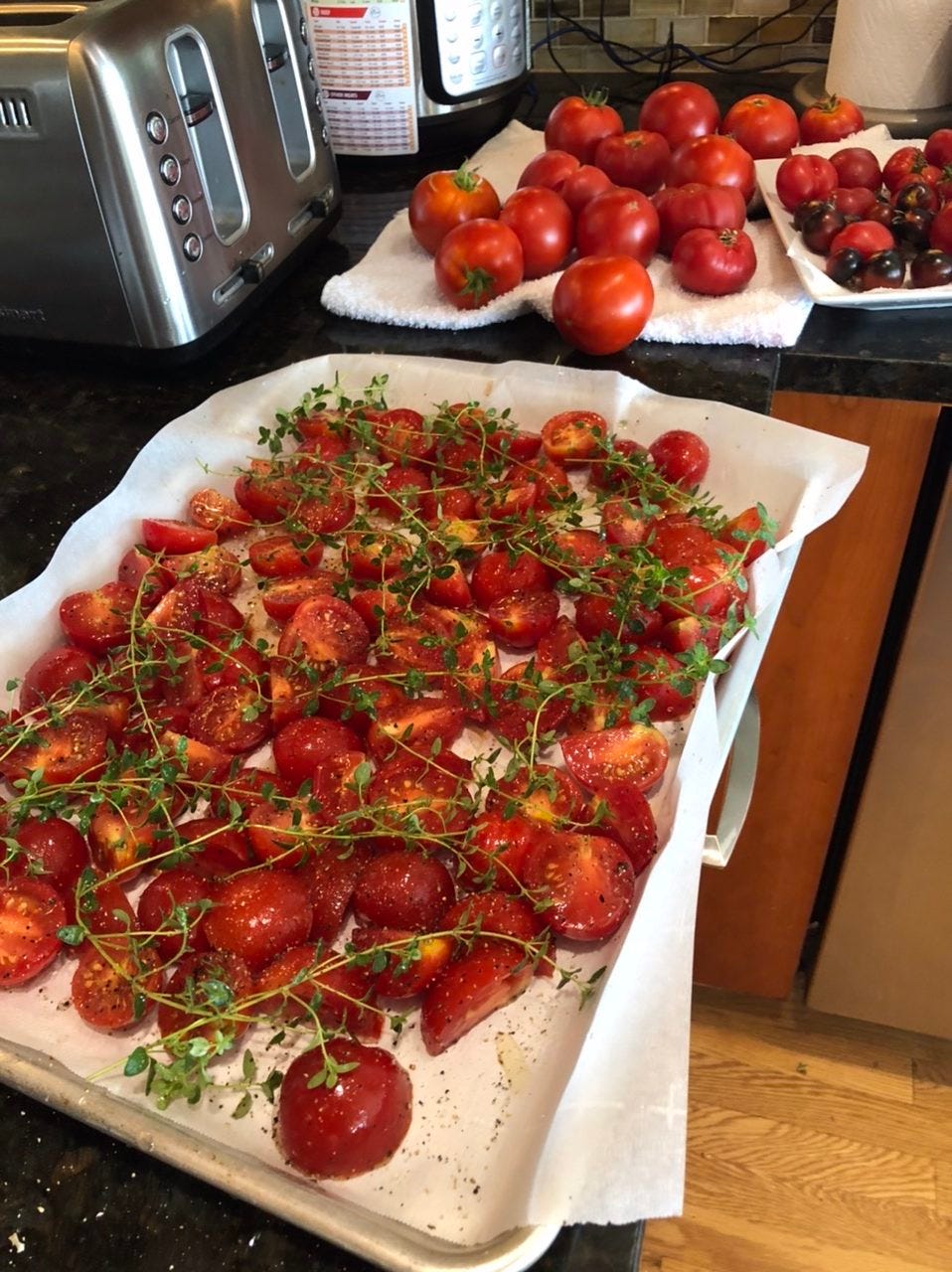 Those are the smaller and medium sized tomatoes, cut in half or quarters. I tossed them with olive oil and salt and pepper, then put fresh thyme on top and stuck them in the oven on low heat (300 on my oven, which tends to run cool). They’ll sit in there until they are collapsed and look like sun dried tomatoes.