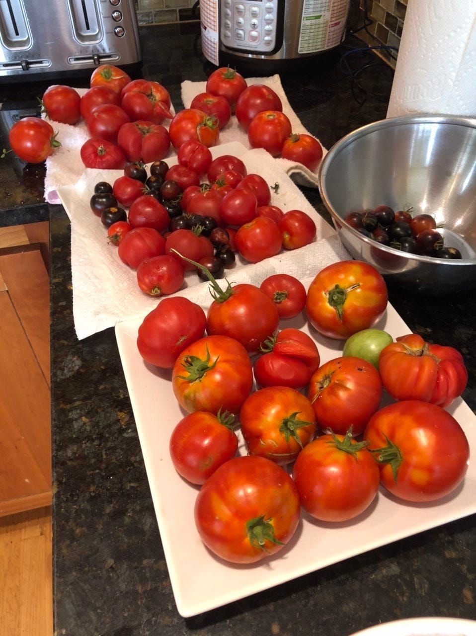 Today is roast tomato day. The larger ones will go into tomato sauce for the freezer, but a lot of these are getting roasted.