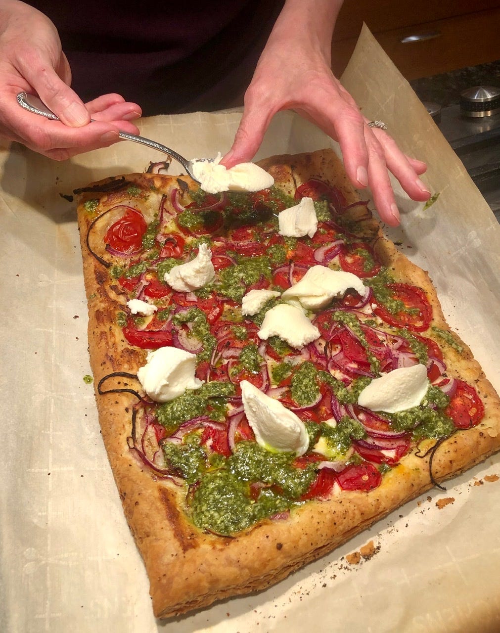 That is a tomato tart with pesto and ricotta. That very one up there was dinner last week, it was so good that we’re making it again. It couldn’t be easier. Here is the recipe, it is from NY Times Cooking. This tastes sort of like the world’s best pizza, if you were asked to make pizza and didn’t know it wasn’t supposed to be made with a puff pastry crust. It is divine, and relatively healthy.*