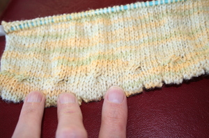 And here's where I am now. The hem is turned up and pinned so you can see it. The edging is done by knitting 5 rows, doing a picot turning row, then knitting more rows, then a simple 4 stitch cable crossing all the way across.