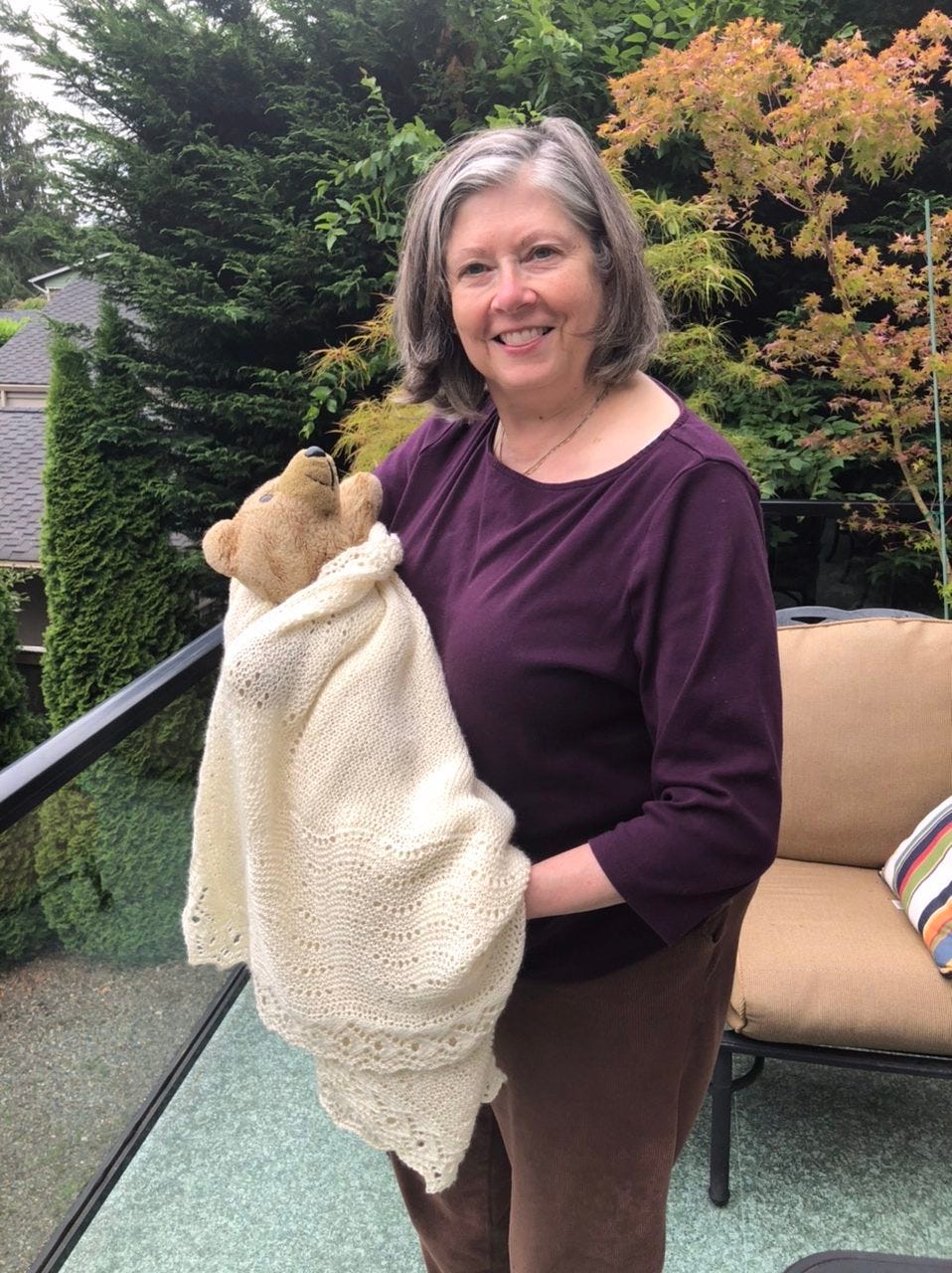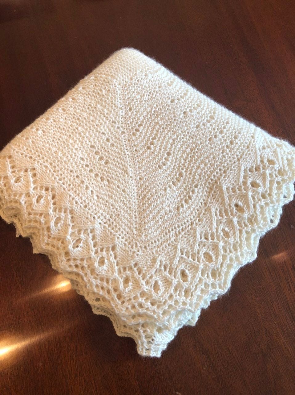 This is the second one of these I’ve knit. The pattern is well written, very simple to follow, and would be suitable for a novice knitter. Nicely formatted, it uses knit, purl, basic increases and decreases, picking up stitches along the edge, and doing a knitted on edging. It’s perfect for a baby blanket, but works as a shawl as well. I might make one of these for me someday to wear as a shawl.