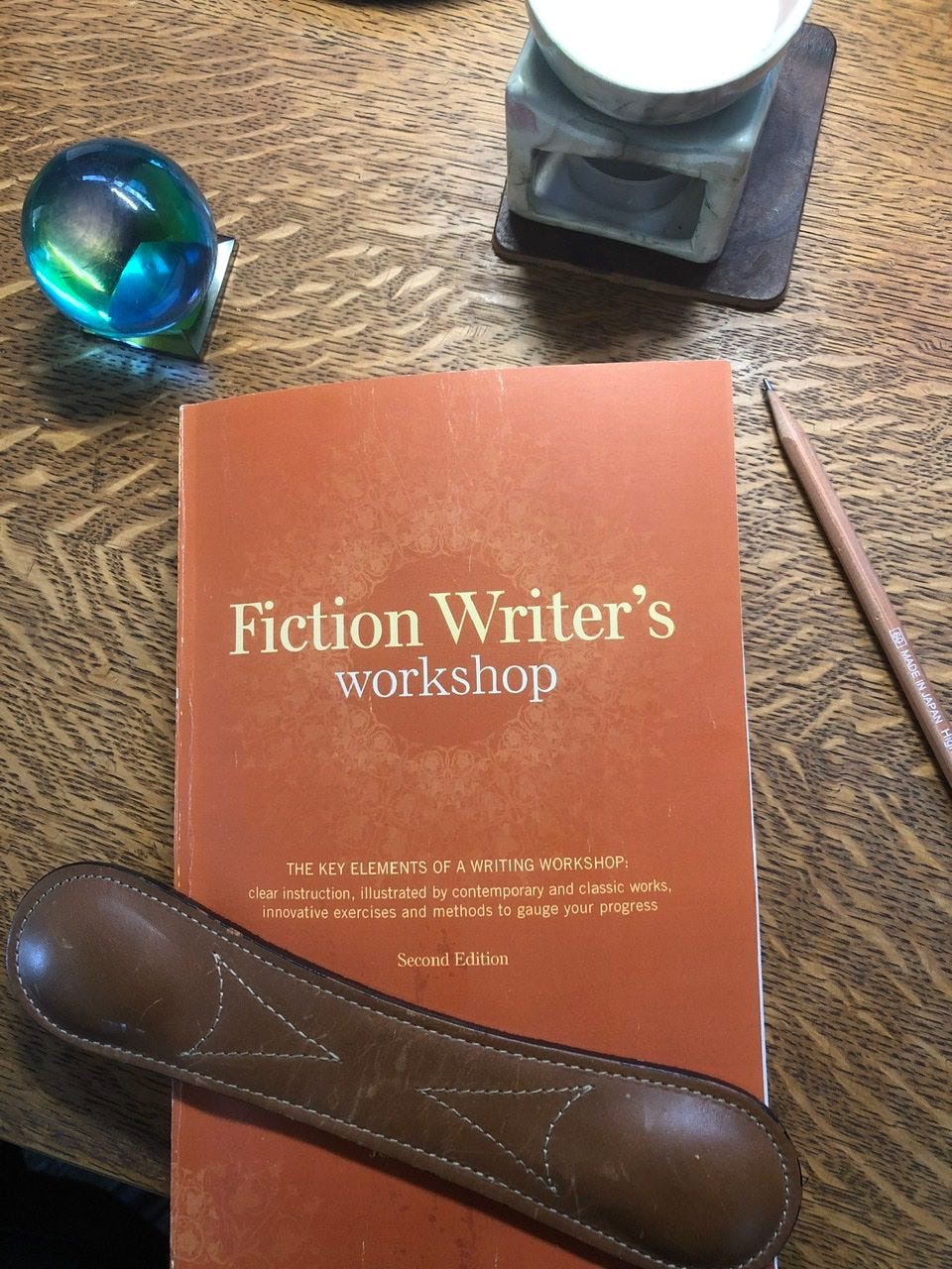 My book weight is hiding the author’s name, this is the Fiction Writer’s Workshop by Josip Novakovich. It is set out in clear chapters, with a ton of writing exercises for each section. So I started a new project file**, and am writing away.