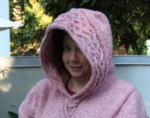 What I learned: Patience! This one took me a long time to finish, due to my apparent ineptitude at walking. I also have learned to keep on measuring gauge as I'm going along. This sucker is a bit big for me, but there is no way that I'm giving it away, or worse, reknitting it. I wanted it baggy, because I will mostly wear it as a jacket outside (though I'm currently sweltering in it in the house because I just had to wear it today!). This is a bit baggier than I intended, but what the heck. I learned a lot about knitting cables also. That kangaroo pocket was a hoot to knit. Next time I do something like this with a hem, I will consider doing a provisional cast on, then knitting the hem up to the body. This pattern was just so much fun that I might make it again. I also just LOVE this yarn. It is so soft that I can wear it without any itch-factor at all, even right next to my skin. I already have another batch on order to make another sweater. Maybe another Rogue even??