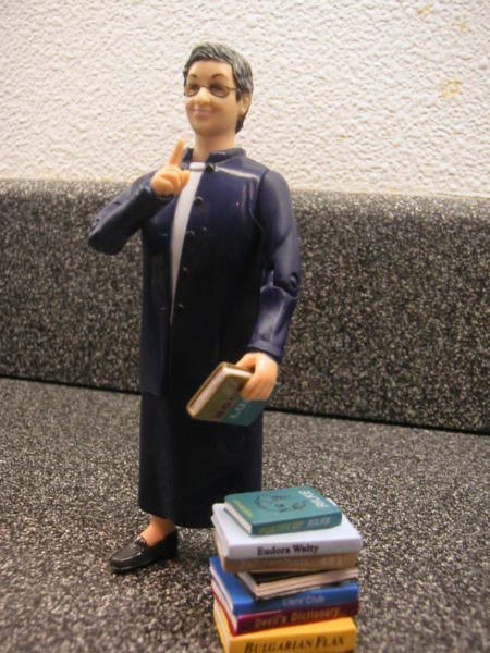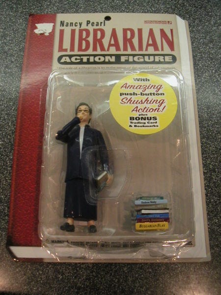 This comes complete with librarian bookmarks, and a Librarian Action Figure Trading Card. By the way, the librarian is supposed to be Seattle librarian Nancy Pearl, author of Book Lust. It's a great book.