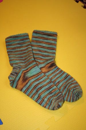 I didn't record the final details of this one on my blog. This is Socks That Rock sock yarn, the lightweight version, I believe. It's the color Rainforest Jasper from the Sock club, though I used my own pattern. 68 stitches on size 1 needles, picot hem, heel flap and gusset. What's not to like? I finished these in September 2006, for me.