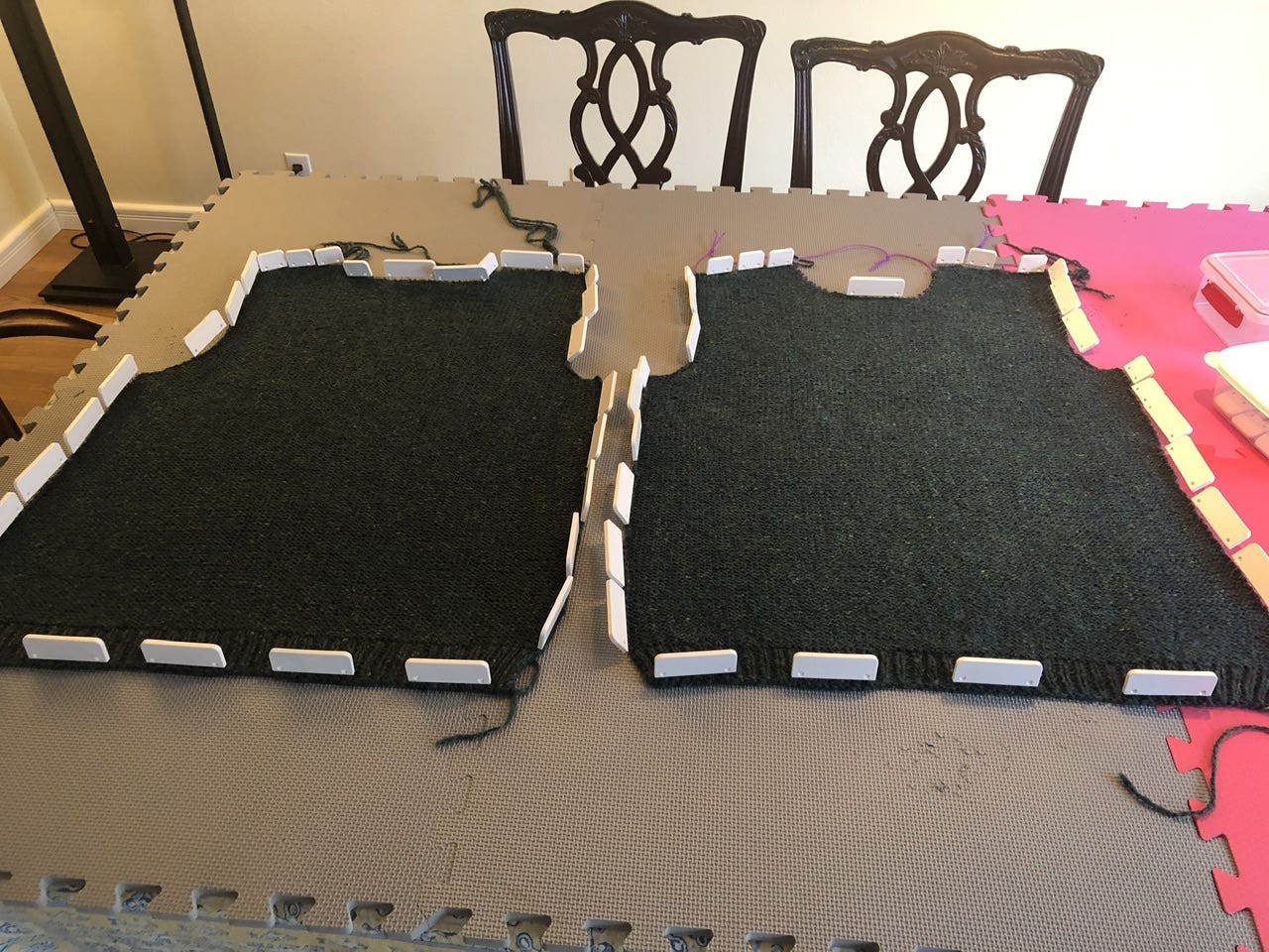 Since we had a bit of cooler weather today (and rain!), I decided to get the front and back blocked. Once I get to the sleeve cap*, I’ll block that first sleeve so I can start sewing it up without having to wait for the whole thing to dry.