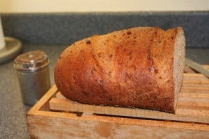 Here's what's on the table this week. Note that I almost missed the photo opportunity. I left this out to cool before putting it in a storage bag, and before I knew it, a third of the loaf was gone.