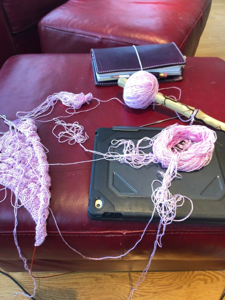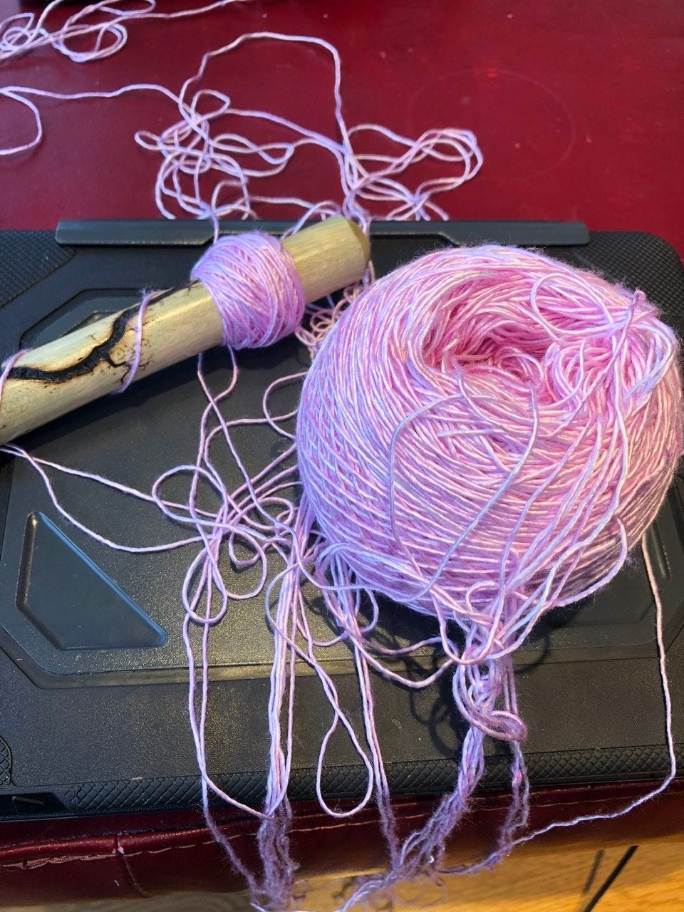 I settled in this morning for some relaxing knitting, or so I thought. The yarn is 100% silk, and very slick. I wound it up using my swift and ball winder, which clearly was not the way to manage this.