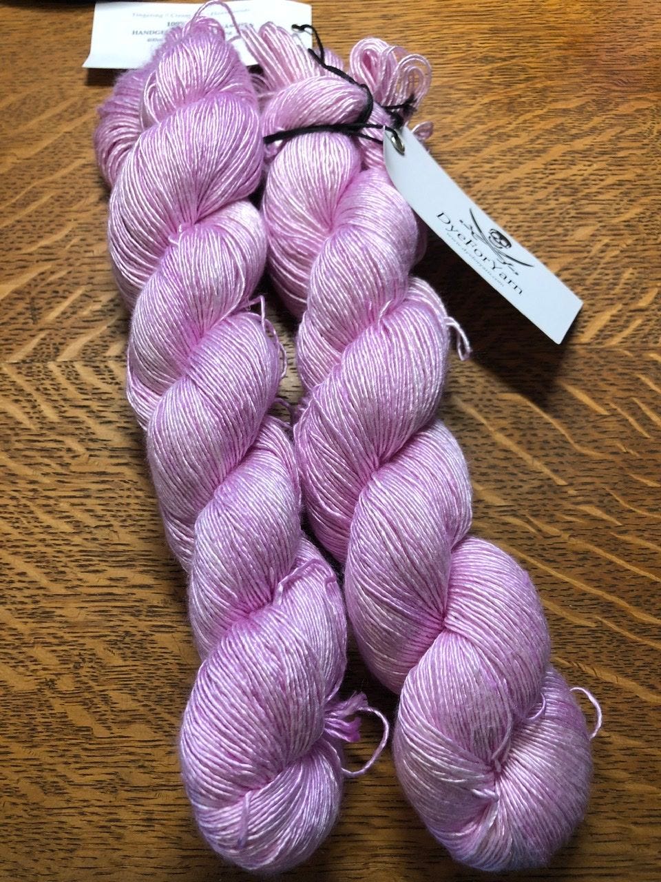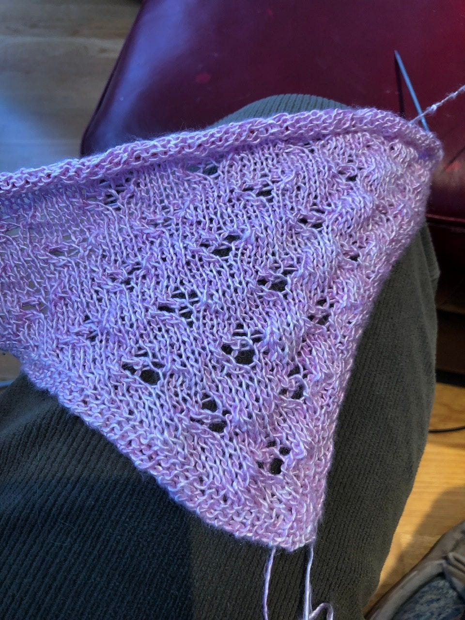The pattern is Quatrefoil, by Janina Kallio. It’s a dead simple lace shawl pattern, easily memorized after the first few repeats. The yarn is divine. It is Creamsilk, from DyeforYarn on Etsy.
